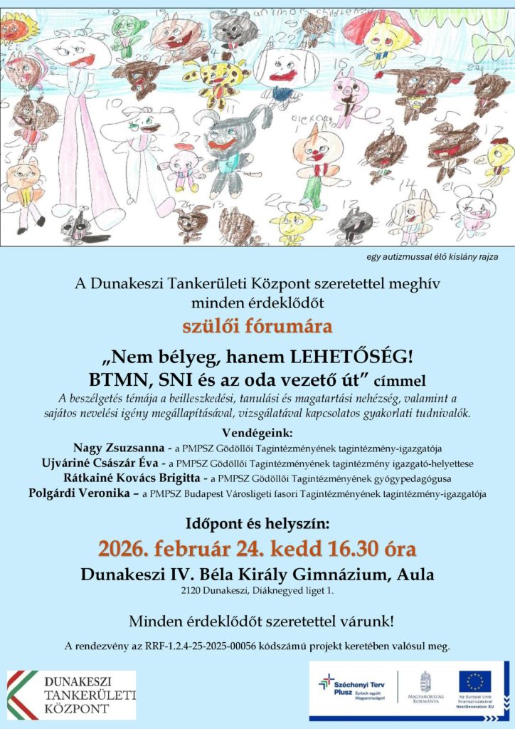 A Dunakeszi Tankerületi Központ szülői fórumot szervez “Nem bélyeg, hanem LEHETŐSÉG! BTMN, SNI és az oda vezető út” címmel. A beszélgetés témája a beilleszkedési, tanulási és magatartási nehézség, valamint a sajátos nevelési igény megállapításával, vizsgálatával kapcsolatos gyakorlati tudnivalók.