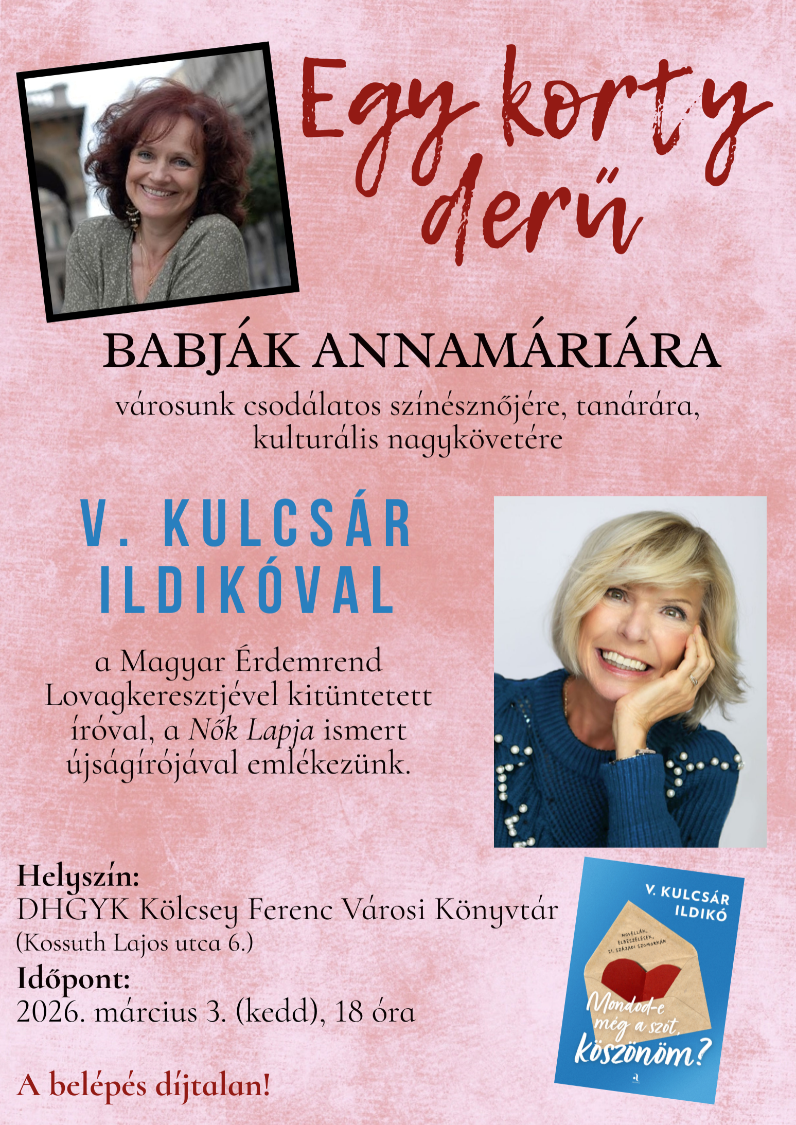 Az Egy korty derű című program vendége V. Kulcsár Ildikó, a Magyar Érdemrend lovagkeresztjével kitüntetett író, a Nők Lapja ismert újságírója lesz. Az est során felidézik Babják Annamária személyiségét, munkásságát és azt a derűt, amelyet a színpadon és a mindennapokban egyaránt képviselt. A szervezők célja nem csupán az emlékezés, hanem az a közös lelki találkozás is, amely méltó módon őrzi tovább a művésznő szellemi örökségét.