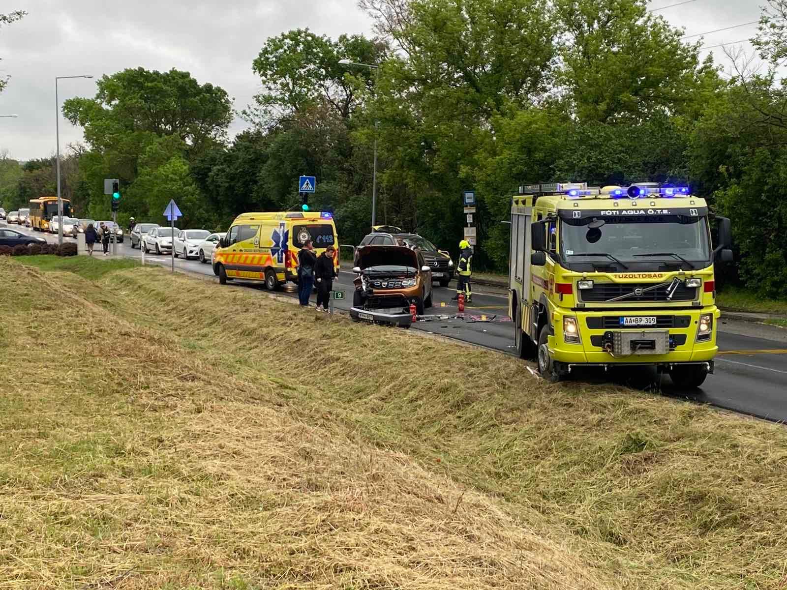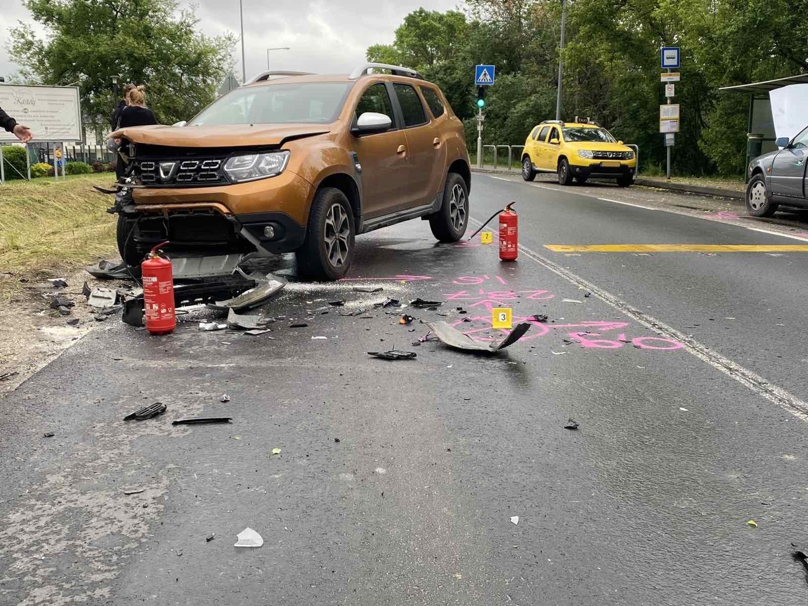 Frontális ütközés történt ma délután a Fótligeti behajtónál. Egy kanyarodó autó kikerülése közben egy másik autó áttért a szemközti sávba, ahol frontálisan ütközött a szemben közlekedő Daciaval.