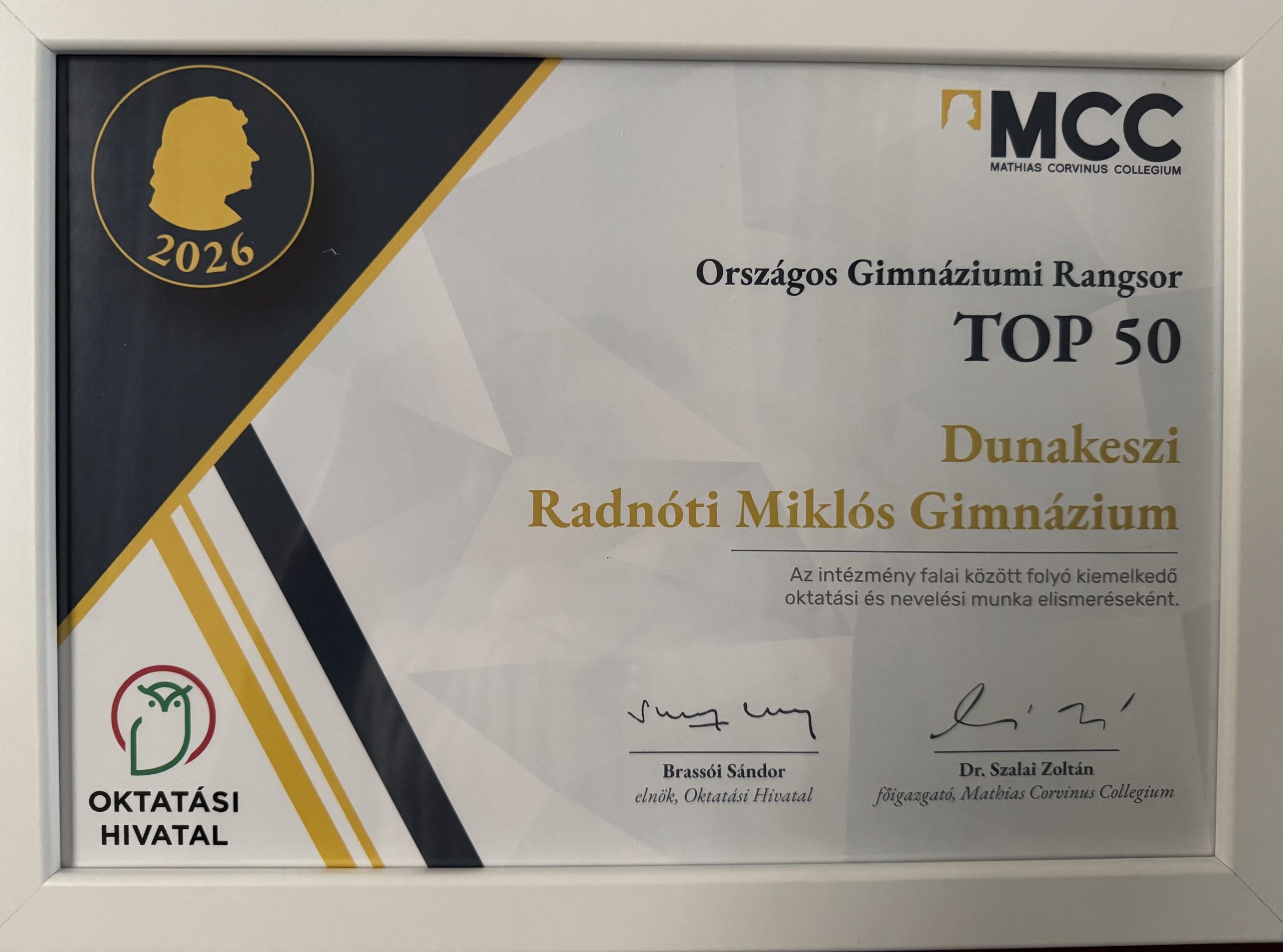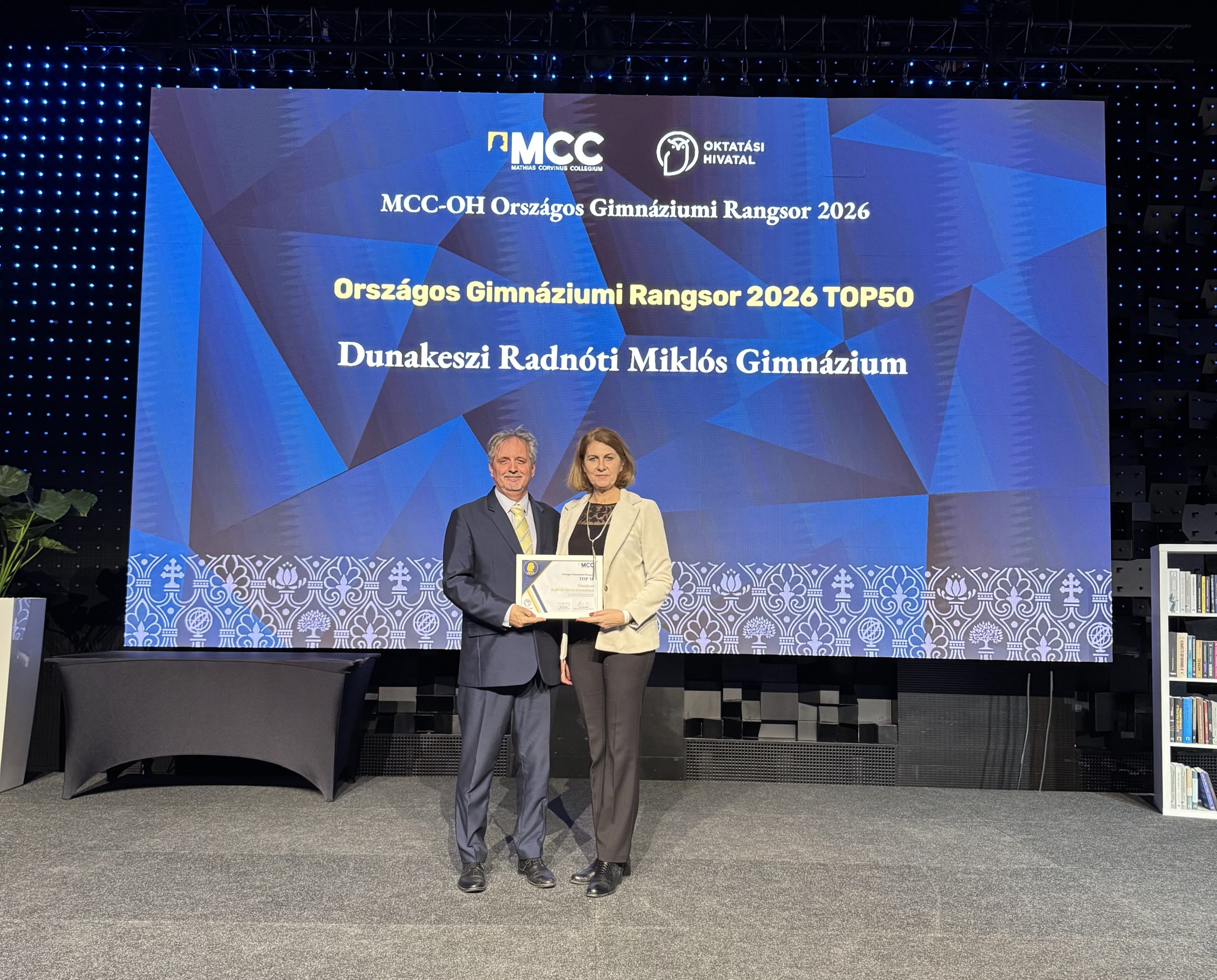 Bekerülni a TOP 100 gimnázium közé önmagában is nagyszerű eredmény, de az, hogy hosszú éveken keresztül a legjobb 30 körül lenni, az már komoly teljesítmény. A Radnótinak pedig ez rendre sikerül mind a HVG, mind az MCC felmérése szerint is. Január 18-án második alkalommal rendezték meg az MCC-OH által készített középiskolai rangsor díjátadóját, ahová az ország 100 legjobb középiskoláját hívták meg. Az eseményen többek között Maruzsa Zoltán köznevelésért felelős államtitkár, Brassói Sándor, az Oktatási Hivatal elnöke volt jelen és tartott ünnepi beszédet. A mérés az iskolák 7 különböző mutatója alapján készült el, mint például a érettségi eredmények, felvételi eredmények, továbbtanulási mutatók, kompetenciamérési eredmények, jelentkezők száma. A Dunakeszi Radnóti Miklós Gimnázium remekelt a felmérésen.