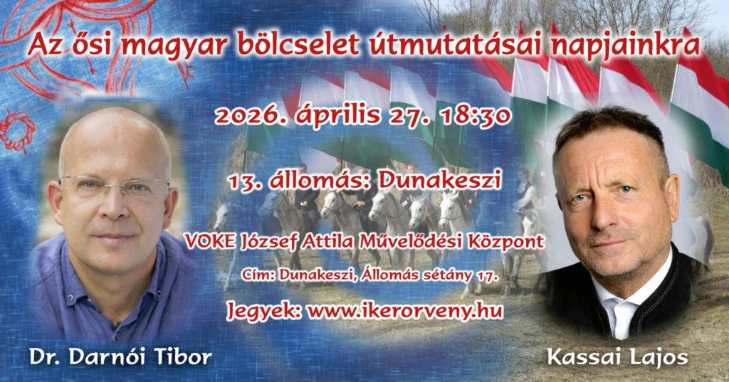 Április 27-én, 18:30-tól Az ősi magyar bölcselet útmutatása napjainkra címmel tart előadást dr. Darnói Tibor és Kassai Lajos.