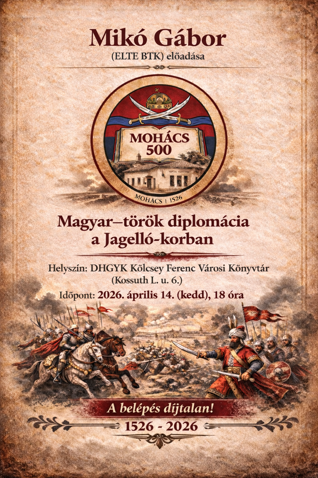 Április 14-én a könyvtárban Mikó Gábor előadását hallgathatják meg az érdeklődők Mohács 500 címmel, amely a történelmi esemény évfordulójához kapcsolódik.