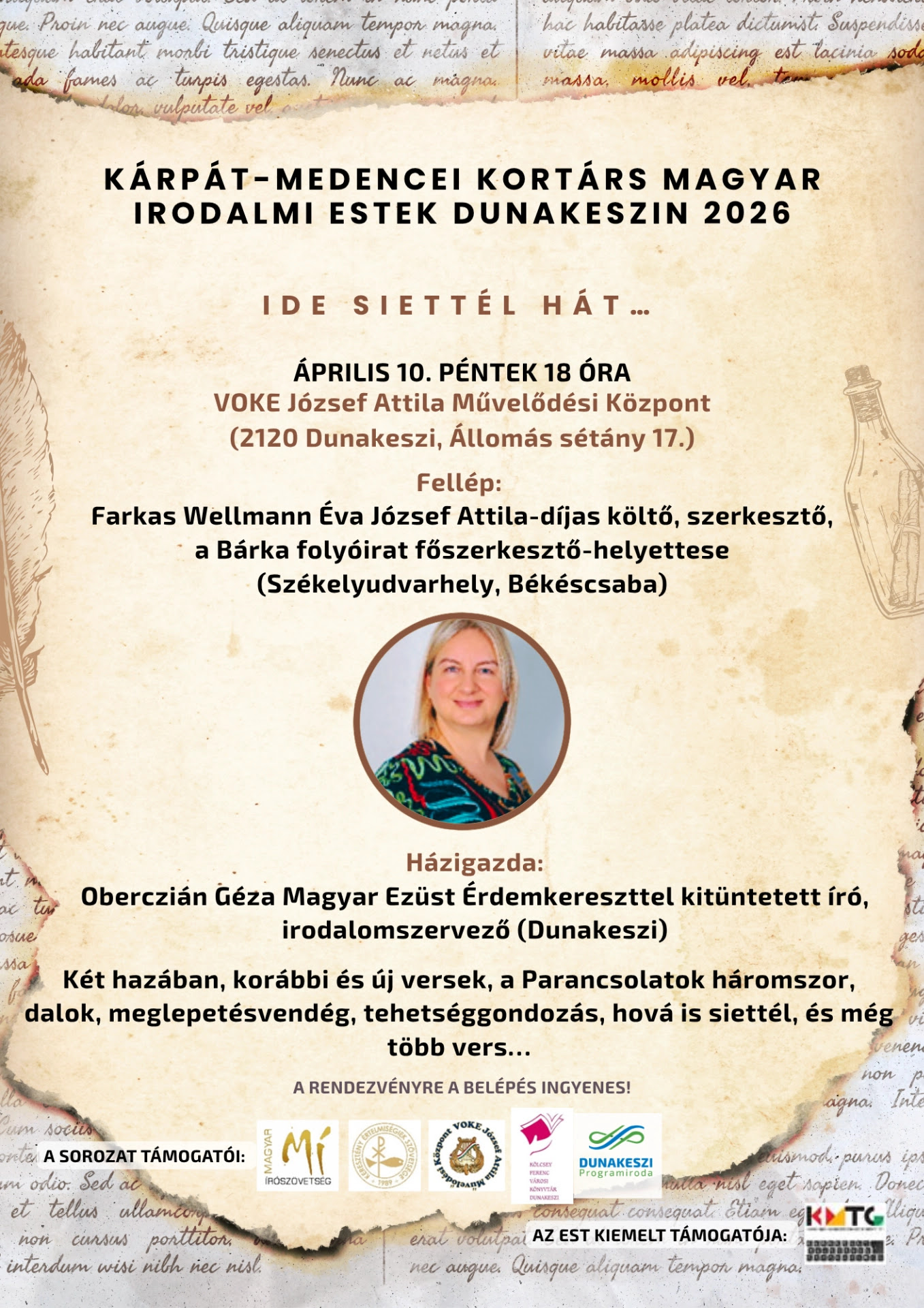 Szintén április 10-én, 18 órától Farkas Wellmann Éva költői estjét rendezik meg a VOKE József Attila Művelődési Központban.