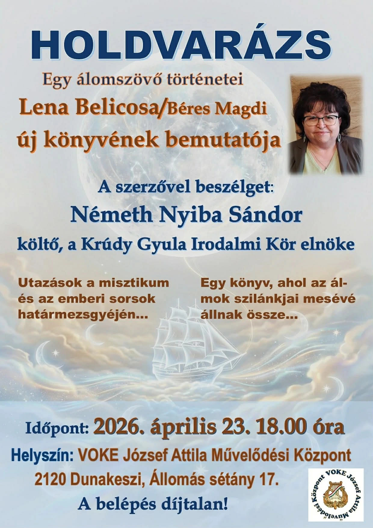 Április 23-án, 18 órától a Holdvarázs – Egy álomszövő történetei című kötet bemutatóját tartják, amelyen Lena Belicosa, azaz Béres Magdi új könyvével ismerkedhetnek meg az érdeklődők.