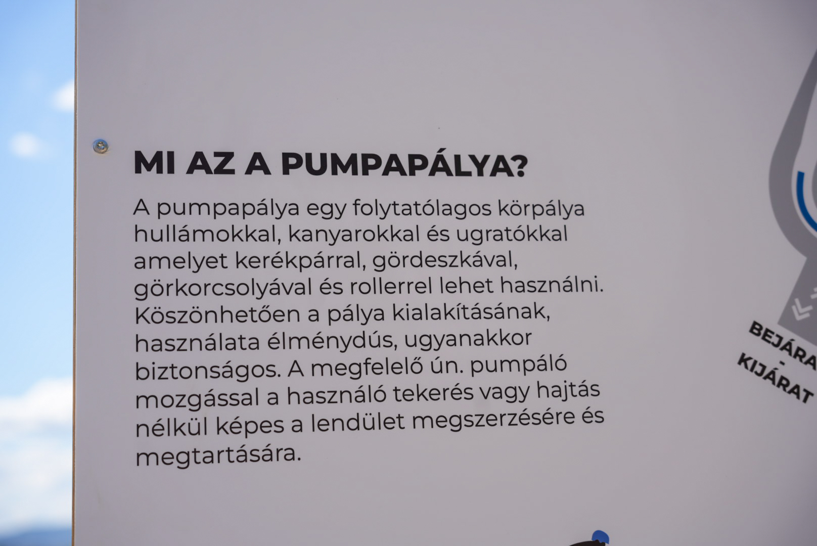 A pumpapálya egy olyan folytatólagos körpálya, melyet kanyarok és hullámok alkotnak. Formájának köszönhetően élvezetes, ugyanakkor biztonságos kikapcsolódási lehetőség. Az aszfalt pumpapályák használhatók bármilyen típusú kerékpárral, gördeszkával, görkorcsolyával, rollerrel, szinte bármivel, ami gurul, ráadásul bármilyen korú és tudásszintű kerékpárosok használhatják. Egy jól megépített pálya egyaránt tökéletes az alapok elsajátítására, ugyanakkor alkalmas profik edzésére és versenyzésre is – ahogy a most kialakított dunakeszi pálya is. Pedálozás helyett a testsúly áthelyezésével, ún. “pumpálással” tudjuk hajtani magunkat. Ezek a jellemzők teszik különlegessé és népszerűvé a pumpapályákat napjainkban, a játszóterek egy új világát létrehozva.