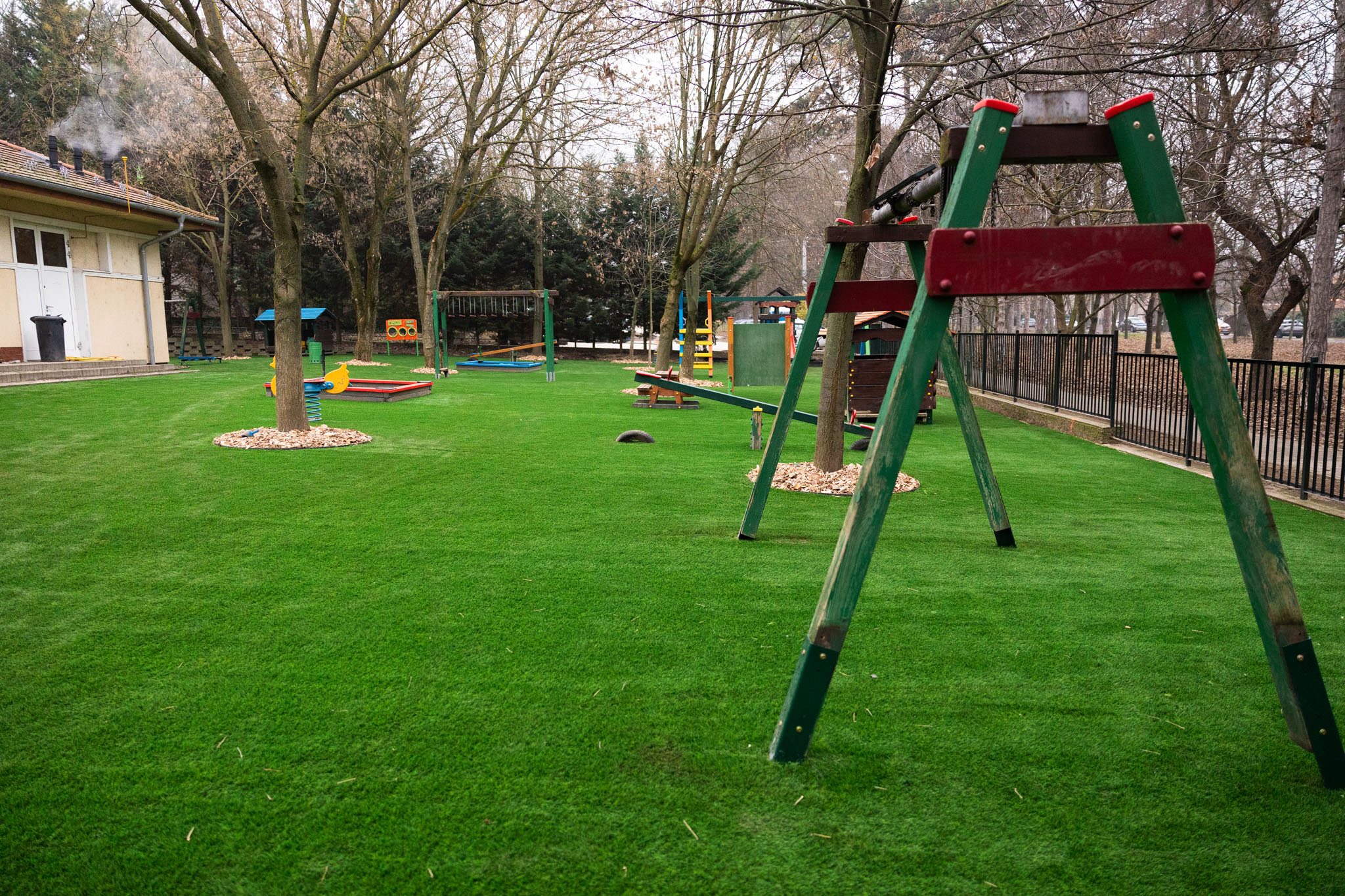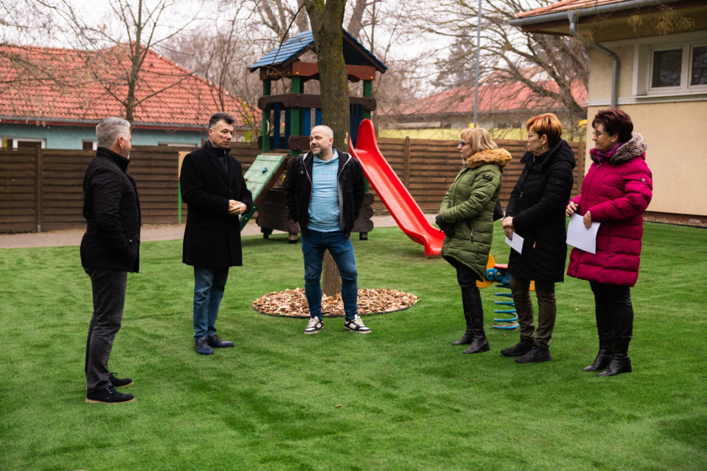 Az árnyékos fenyves alatt sajnos többszöri próbálkozás után sem sikerült élő füvet varázsolni az udvarra, “így a Dunakeszi Közüzemi Nonprofit Kft. szakmai irányítása mellett, óvodapedagógiai szempontokat figyelembe véve választottuk ezt a lehetőséget. Több mint 1000 m2 lett gyermekbarát és fenntartható” – írta a közösségi oldalán Dióssi Csaba polgármester.