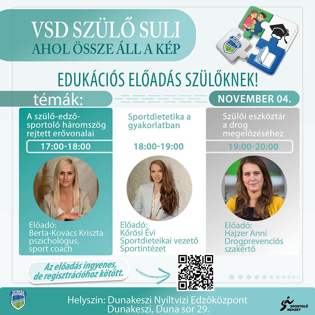 Minden fiatal sportoló mögött ott áll egy támogató szülő. Ez az egyik legnehezebb feladat, hiszen tele van a szülő dilemmával. Ez valóban a gyermek álma, vagy csak én szeretném? Hol van ebben az én szerepem? Motiválom vagy erőltetem? Bele kell-e szólnom, vagy elég bíztatni és vígasztalni, ha úgy adódik? Ezekre a kérdésekre is választ ad a következő VSD Szülő Suli, ahol három kiváló szakértő osztja meg a tudását és a tapasztalatát.